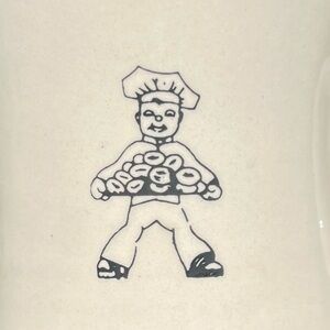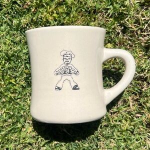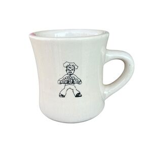 Vintage Dawn Donuts Heavy Diner Coffee Mug. Featuring the donut man graphic on the front. Substantial feel, indicative of an older mug likely from the original donut shop.