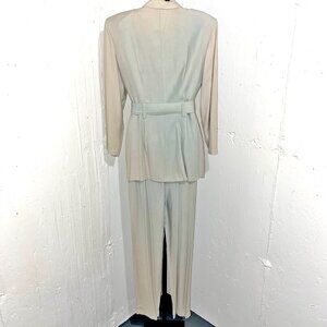 This 80s Throwback Vintage Dawn Joy Fashions Brand Women's Size 10 Business Suit Set means business! This set includes one jacket with sewn-in shoulder pads, one pair of elastic waist pants and a matching waist cinching belt. The whole set is a light green or pistachio color. 50% Acetate 50% Rayon. There is a stain on the right collar (see images) and the original color is faded. But if someone knows how to recolor clothing then this is PERFECT for anyone that's an enthusiast of 80s style because three piece set is in perfect condition! Measurements are below and in photographs. Make me an offer for this unique set!