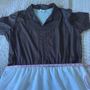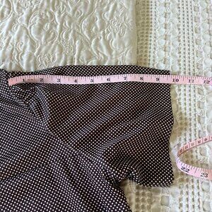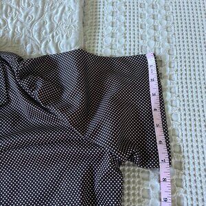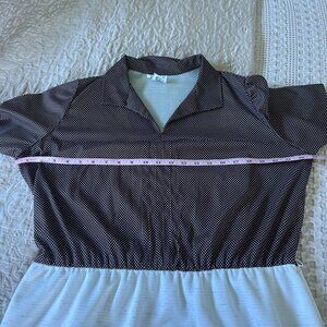 A charming vintage midi dress featuring a brown polka-dot top and a cream skirt. Ideal for casual or semi-formal settings with a timeless appeal.