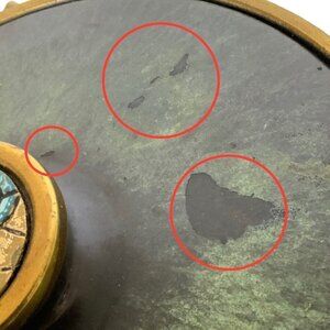Lid has surface scratches and dings. Interior is stained. Good vintage pre-owned condition overall.