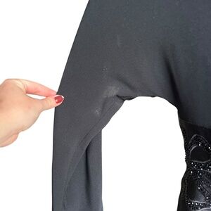Elegant and timeless vintage Daymor Couture wrap dress in a sleek black polyester blend. Features a draped neckline, beaded floral waist detail, and a faux wrap silhouette that flatters the figure beautifully. Long sleeves and a maxi length make this a stunning option for formal occasions or evening wear.
