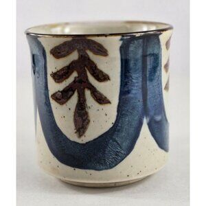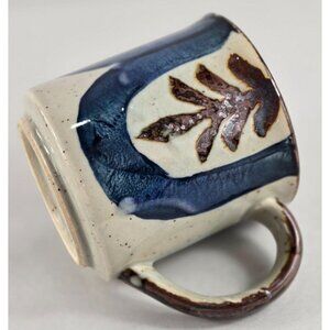Medium size stoneware ceramic coffee mug with rustic design that invokes 70s vibes. Tan coloring with a blue U-shaped band surrounding a brown overhanging leafy design. Style of mug is similar to Ryukyuan pottery from Japan. In great condition.