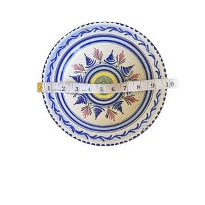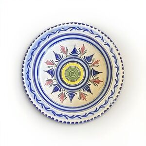 This vintage De La Cal hand-painted ceramic plate from Spain is a beautiful 10-inch piece with a unique multicolor design. The round plate features intricate artistry on the ceramic material, making it a decorative piece perfect for all occasions. Handmade with a vintage flair, this signed plate showcases the artistry and craftsmanship of Spanish pottery, adding a touch of charm and elegance to any home decor.