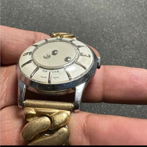 Vintage De Luxe Swiss Made Mystery Dial Mens Mechanical Wind Up Watch Working shows signs of normal wear for its age such as scratches on case band and crystal as well as discoloration and tarnishing see pictures for reference