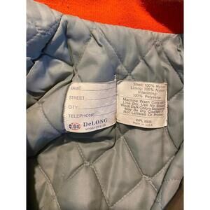 Authentic vintage DeLong bomber jacket, men’s XL, made in Korea. Features a rugged nylon shell, quilted lining, and full snap-front closure. Ribbed collar, cuffs, and waistband in orange and navy add a bold 90s streetwear vibe. Back is printed in orange with “Wiebke Fur Co – Eitzen, MN,” giving it a unique small-town Americana edge.