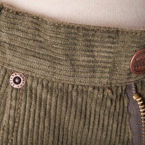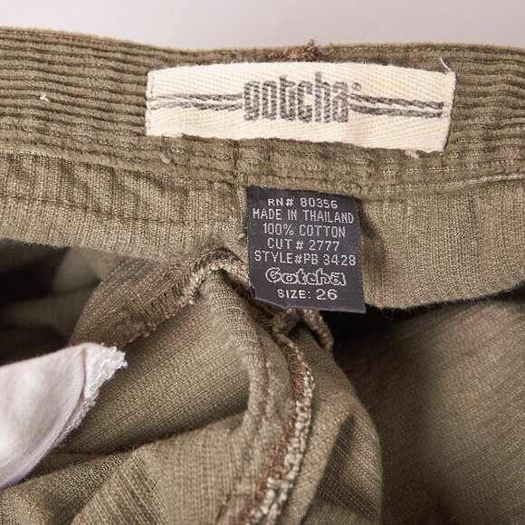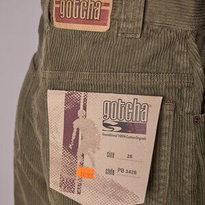The pants are in deadstock condition, still have tags. They are a green color. Nice thick cords. Made by the surf skate company Gotcha. They are 100% cotton. Marked a size 26 and measures 32 cm across waist, 30 cm rise, 62 cm inseam.