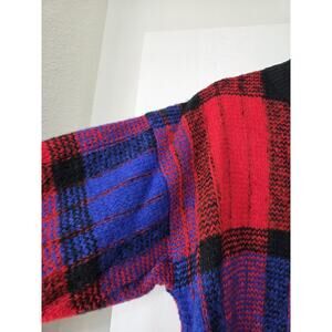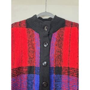 Style: Chunky and oversized NWT vintage colorful cardigan sweater. Mock, ribbed neckline. Full button closure down the front. Oversized buttons. Long, dolman style loose sleeves (ribbed wrists). Large shoulder pads. Chunky and tight-knit. Fuzzy finish (not especially soft). Boxy relaxed fit. 100% Acrylic. Stretchy. Made in Taiwan. Hand Wash Only.