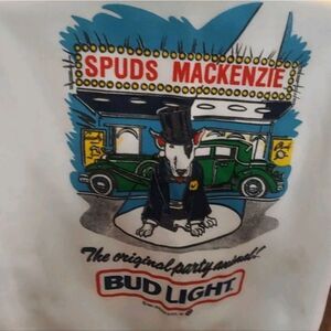 This is an awesome deadstock vintage Spuds Mackenzie sweater from 1987. Two tone with light grey arms and a white body. Graphic print featuring Spuds in a suit and top hat in front of a antique car with a light up marquis above him. Reads "Spuds Mackenzie The Original Party Animal". Has the original tags attached.