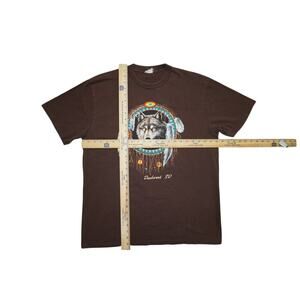 Step into vintage Western vibes with this bold Deadwood, South Dakota souvenir tee. Featuring a stunning graphic of a gray wolf centered in a beaded dreamcatcher design with feathers, tribal symbols, and bright turquoise detailing. Printed on a rich chocolate brown blank, this tee gives major Y2K, grunge, and native-inspired aesthetic. Soft cotton fabric with single-stitch sleeves, tagged XL with approx. 23" pit to pit x 28" length.