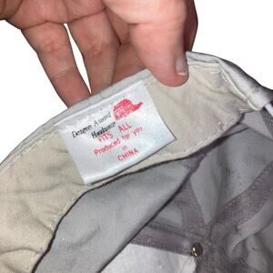 Classic vintage Death Valley tourist snapback hat in white with rope detail on the brim. Features embroidered desert donkey design with pink sun and “Death Valley” text. Lightweight fabric with plastic snapback closure. Made by Dream Around, fits all. Shows light wear and some spotting on fabric (see photos), adding to its vintage charm. Perfect for collectors of National Park memorabilia or retro tourist hats.
