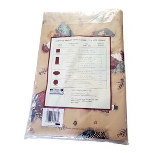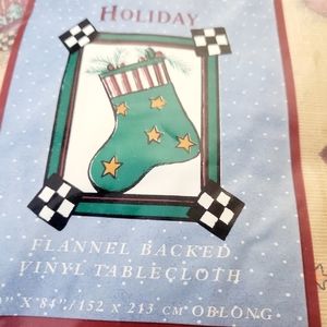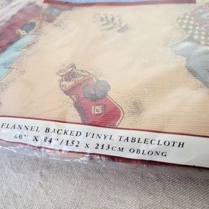 This vintage tablecloth from Debbie Mumm's Magic of Santa collection is perfect for the holiday season. New in package .The oblong shape measures 60 x 84 inches and features a colorful Santa pattern that will add a festive touch to any room. Made of vinyl with a flannel back, this tablecloth is both durable and easy to wipe clean.