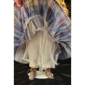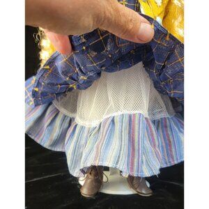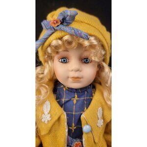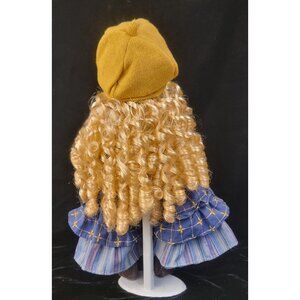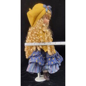 Vintage Debbie Doll by Debbie Visconti, 2006. This porcelain doll Porcelain Doll is identified as "Debbie" from the Debbie Collection Special Edition, crafted by Debbie Visconti and released in 2006. She features long, blond curly hair, blue eyes, and is wearing a blue plaid dress and matching sweater and hat. Her head, arms, and feet are porcelain, coupled with a soft body. Approximate height is 15 inches. Stand included. Please see the provided photos for further details.