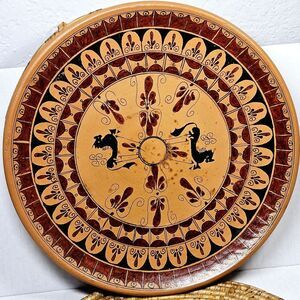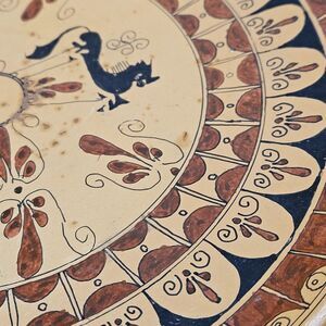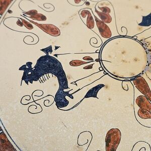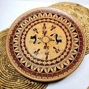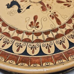 This vintage wall decorative plate is a stunning piece of art with its Greek design with red and black art finish. The round shape and multicolor accents make it a unique addition to any collection. Its ancient Grecian theme adds a touch of history to any room and is sure to be a conversation starter. Some spots of age can be perceived. Please see the photos.