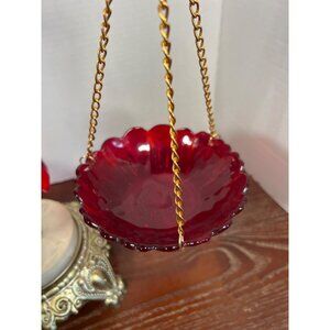 • Ruby red glass hanging bowls with scalloped edges
