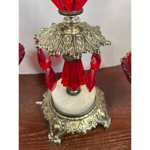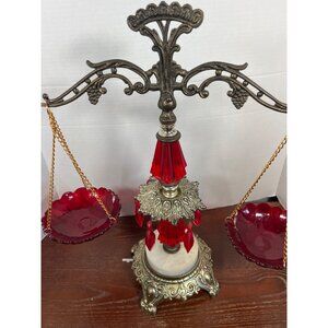 This vintage decorative scale combines ornate brass detailing with striking ruby red glass bowls and crystal accents, adding an elegant touch to any space.
