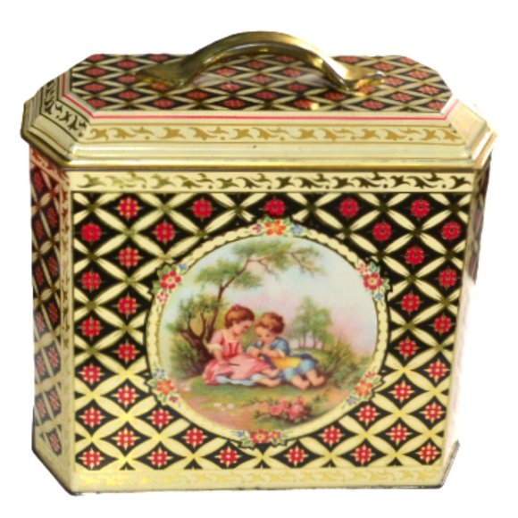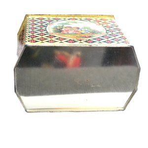 Vintage decorative tin that was once for English Biscuits. Inside is clean, could use for non food small items. Most of the wear is under the lid, which is a little difficult to lift up.