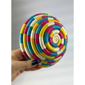 Vintage Decorative Woven Bowl Turquoise Yellow Pink Ivory 7”