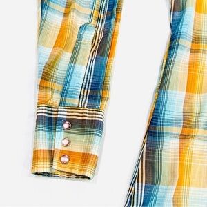 Vintage Dee Cee Brand Authentic Western Wear Orange Blue Long Sleeve Pearl Button Down Shirt - EUC - size 15-33. Measurements in photos.
