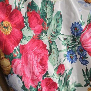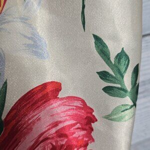 Elegant slip dress with vibrant floral print and lace trim. Features a mix of red, pink, yellow, and green colors.