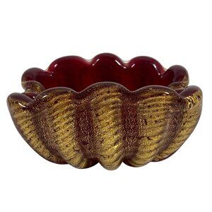 This stunning mid-century bowl features deep red art glass with intricate gold flecks inlay. Perfect as a trinket dish or decorative piece, it adds a touch of vintage elegance to any space.