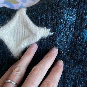 Chunky knit sweater has a very deep V-neck and is made with dark teal, black, metallic teal, and white yarns. Asymmetric pattern with geometric shapes, has great visual and textural elements with the metallic and some 3-D diamond shapes made from Angora.