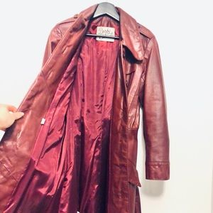 Real leather trench long coat in deep rich red/wine/burgundy color with belt. Gathered details at front waist seam and pleated back design for comfort. This coat is heavy and durable. In good condition, no tears or any damage to the leather. Fully lined inside with unattached pressed hem with some marks inside. It says size 14 on the tag, but it fit me who is small framed at 5’2. See photos for reference!