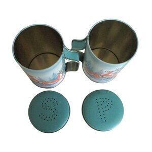 Delight in a charming vintage accent for your holiday table with this deer themed salt and pepper shaker set. These metal tins are adorned with whimsical winter scenes. Shakers are in never used condition.