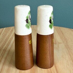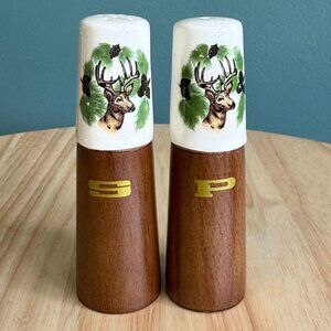 Vintage Deer Salt & Pepper Shakers Wooden Base & Ceramic Tops