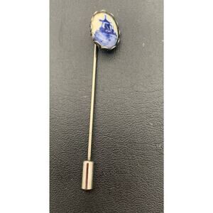 Vintage Delft Blue Porcelain Silver Tone Windmill Stick Pin