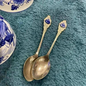 Enchanting Delft-style tea set featuring classic blue and white Dutch windmill scenes and floral motifs. The set includes a charming sugar bowl with decorative silver-tone lid and matching teacup. Perfect for afternoon tea parties, collecting Delft-inspired pieces, or adding European charm to your dining experience. The detailed hand-painted designs and dotted handle accents make this set a delightful addition to any vintage china collection or traditional home decor.