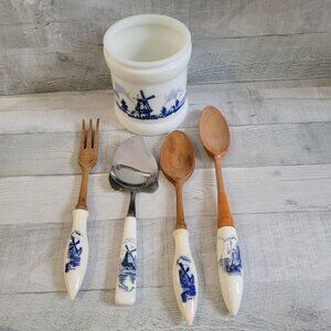 Vintage Delft Dutch Windmill Utensil Set With Ceramic Holder