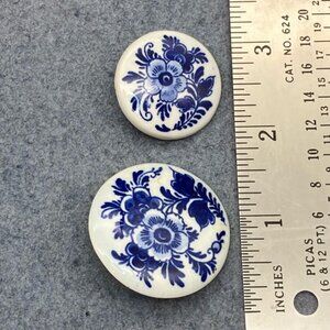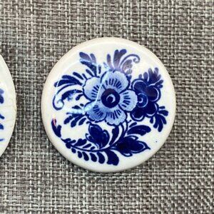 Vintage Delft Holland Brooch Set 1.5 & 1.25 In Floral Blue White Ceramic Signed