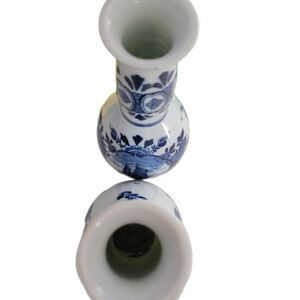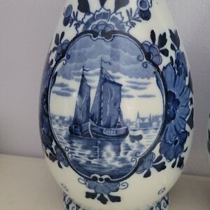 11" tall identical vintage Delfft vases featuring ship in harbor. Fine porcelain with traditional cobalt blue. No chips or cracks, both in excellent condition. These have been lovingly stored in our China cabinet.