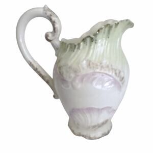 Excellent, preowned condition and vintage or may even be antique this 4 1/2 inch tall cream pitcher is made of fine delicate thin porcelain. If you hold it to the light, you can see the light through the picture. It is creamy white with hand painted lavender and soft greens. Metallic gold is painted on edges of “feathers”, the rim, and the handle. A sweet addition to a collection or to put on display in any decor. 4 1/2 inches tall, 2 inches wide at the base, 2.5” wide at mouth.