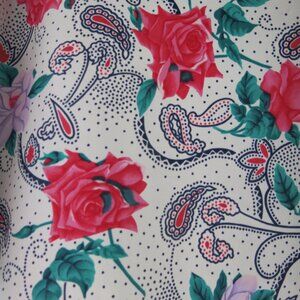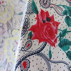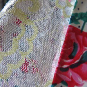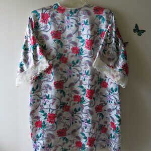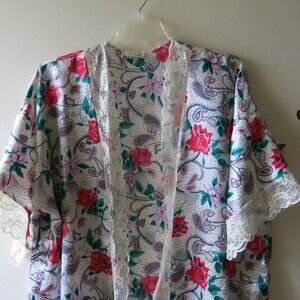 I am presenting you a very beautiful feminine Vintage Floral Satin Lace Gown One Size Fits All in great condition. There is an interesting floral design with pink roses and light purple magnolias. The lace is wide( 2") and in very good condition. The robe will come with its original belt.