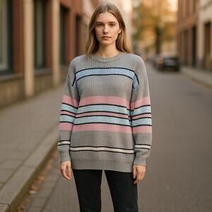 Elevate your casual wardrobe with this charming Delivery Ltd. oversized sweater in a soft gray base with pastel stripes. This chunky knit pullover features a classic crew neckline and ribbed trim at collar, cuffs, and hem. The eye-catching color palette includes baby blue, light pink, mint green, and white stripes against a heather gray background, creating a perfect blend of cozy comfort and 90s aesthetic.