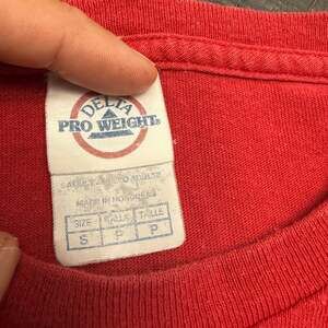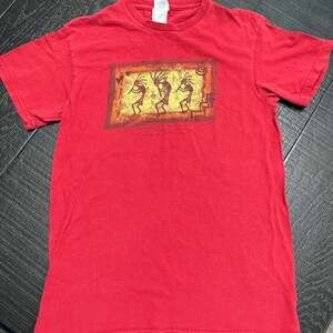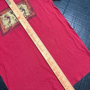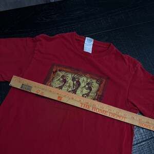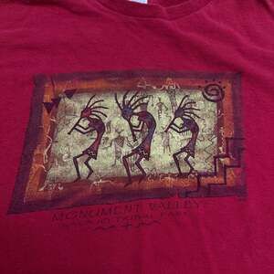 Vintage Delta Pro Weight "Monument Valley Navajo Tribal Park" T-Shirt, size Small. This vibrant red graphic tee features a unique print inspired by Monument Valley, showcasing traditional figures. Made of comfortable cotton, perfect for casual wear. Excellent pre-owned condition with no stains or holes.