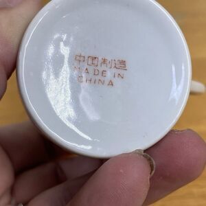 Not seeing/feeling any chips or repairs. Good used condition. Some of the gold trim is wearing off from use. Minor signs of wear from use. See pictures for exact condition of the item you'll be receiving.
