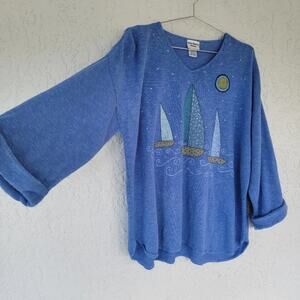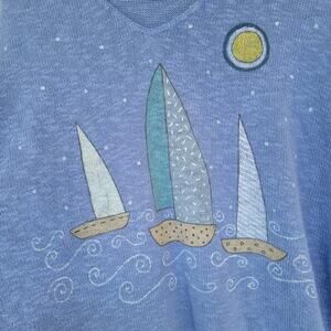 Rare vintage nautical sweater from Den Doris Closet, featuring a beautiful hand-painted sailboat and sun design. Crafted in a soft periwinkle blue cotton knit, this unique piece blends artistic detail with cozy comfort. Designed with a V-neckline, 3/4 sleeves, and a relaxed one-size fit, it’s a versatile collectible sweater made in the USA with imported yarn. A standout piece for nautical lovers and vintage collectors alike.