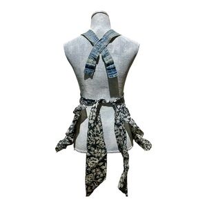 Stylish denim apron featuring colorful floral accents and a black and white ruffle hem. Perfect for adding a touch of flair to your kitchen attire.