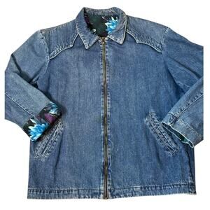 Vintage Denim Blue Jacket with Blue Purple floral lining zip closing size medium