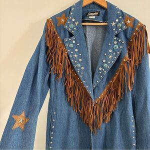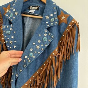 Vintage Denim Fringe Studded Star Western Boho Jacket Festival Gepetto Medium