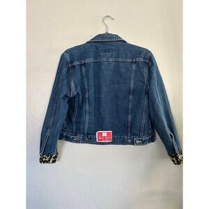 distressed denim, leopard accents, fitted silhouette, casual outerwear, statement details, animal print, stone wash, rugged style, lightweight jacket, streetwear