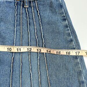Step out in timeless style with this vintage high-waisted denim A-line Jean skirt. Features a flattering flared silhouette with unique vertical seam details on the back and a clean, classic front. Perfect for a modest look with retro 90s or Y2K vibes. Made from durable medium-wash denim with belt loops and a button-zip front closure.