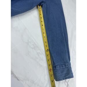 This vintage denim shirt features a festive Santa Claus and reindeer design, making it a perfect addition to your holiday wardrobe. The classic long sleeve button-up style, collared neckline, and embroidered accents add a touch of retro charm. Made from 100% heavyweight cotton denim, this size large shirt is both stylish and comfortable, ideal for casual, workwear, or travel occasions during the winter season. With a solid blue color and a regular fit, this shirt is a versatile and eye-catching piece that captures the essence of Christmas and the 90s.