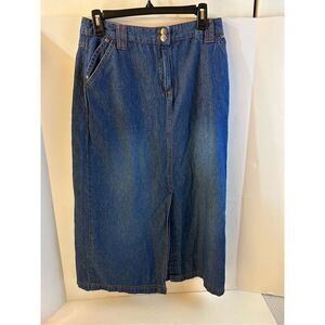 Classic Bill Blass Denim Jeans Skirt w/ Fringe Hemline Frayed 100% All Cotton. Vintage Bill Blass Skirt Size 14 or L or xl. Denim Skirts for women for girls mini skirt with pockets. Hemline has fringe or frayed edge jeans along bottom edge which is securely sewn along hemline. Skirt with a SLIT in Back! Pockets on front only. Belt loops. Metal Rivets. Tapered waistline. Length is above knee, possibly mini skirt nidi aline. Light-Medium Wash Blue Color. Made in Egypt. Measurements Available!