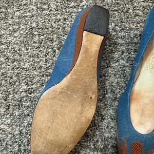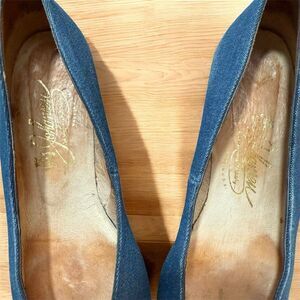 Vintage denim wedge almond toe heels. Leather western style detailing.