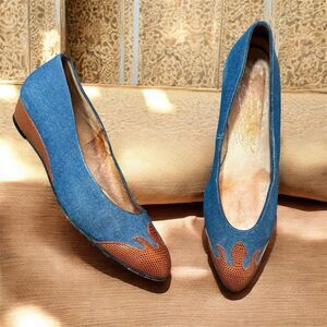 Vintage Denim Wedge Platform Heels 7.5 Retro Pointed Almond Western