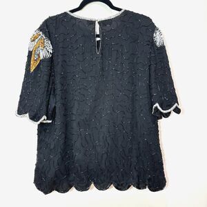 Features: Vintage Denise Elle Beaded Sequin 100% silk top. Exquisite beading and sequins in gold and ivory over black. Even more stunning and substantial in person.