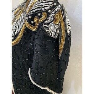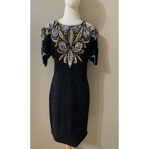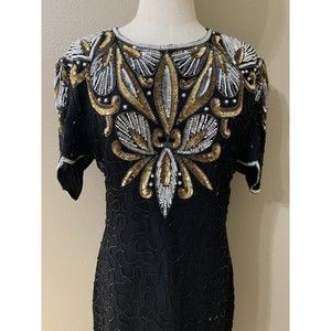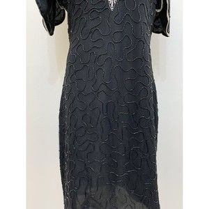Vintage Denise Elle Womens Beaded Sequin Silk Evening Dress Sheath Fitted XL
